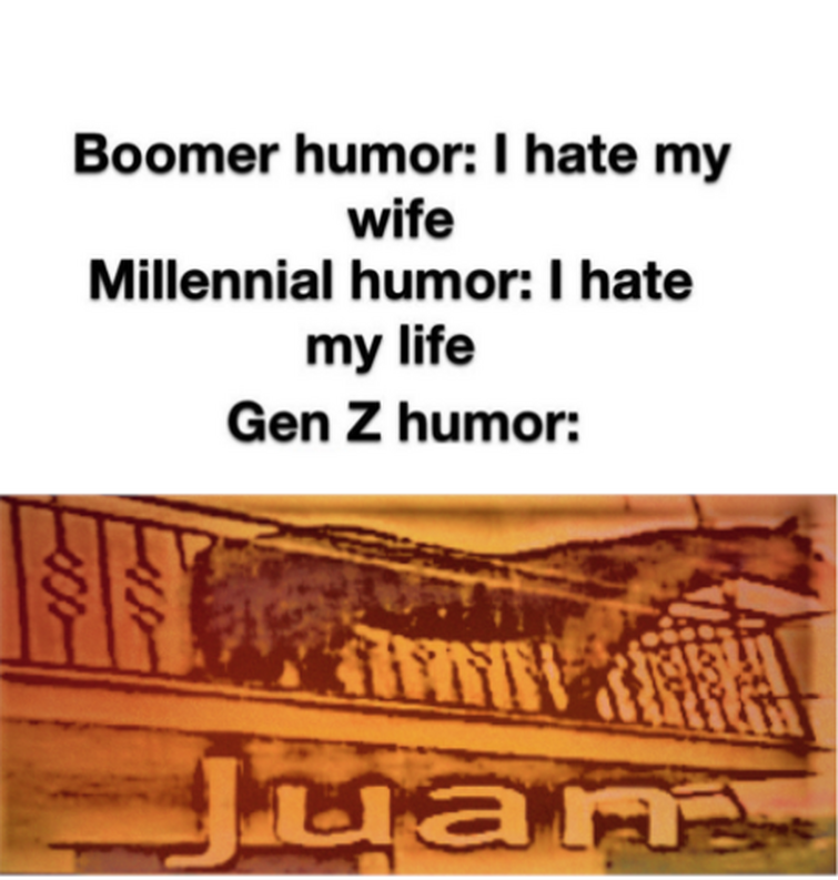 See, at first, people laughed at memes and thought they were funny. They start chatting and the gen z kid says that social justice issues are the biggest problem facing the world, and that the white supremacist patriarchy is a plague on society. As a gen z myself, albeit one of the older ones, i'm no stranger to the surreal humor and 'illiterate' lingo of my generation. Shocking, absurd, nihilistic, and at times downright depressing. Gen z humor is the new dadaist movement.